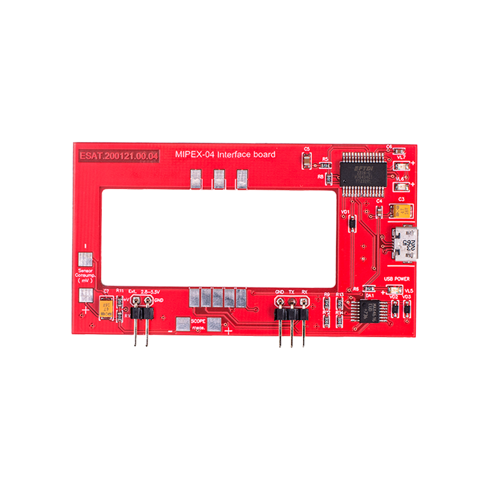 The MIPEX-04 interface board enables high-precision data communication with NDIR sensors. It connects to a PC via USB or, optionally, via UART with 3.3V sensor power supply. The board automatically detects the available COM port in the system. When used with MIPEX ETS software, it supports full-scale calibration (zero and span), real-time data visualization, log saving, and data transmission to technical support.